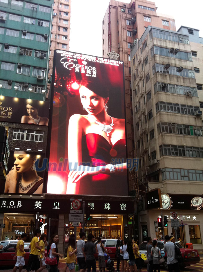 香港罗素街,是香港地标性建筑时代广场的一条主要街道,作为香港最繁华的街道这里一直都是LED显示屏企业必争之地;香港英皇集团作为香港知名的珠宝钟表商,有意借助LED显示屏的展现方式在罗素街这块“宝地”上为其公司宣传造势,LED屏幕的显示效果和维护拆修是否便捷直接影响着项目的成败;hjc黄金城集团 - 黄金城xhjc官方网站人灵活应对,因地制宜根据楼体结构竖立的一个屏型采用P10户外全彩显示屏 5050CREE灯,灯驱合一,2扫,亮度7000,总面积163.43平米,将英皇珠宝奢华低调的美表现得淋漓尽致;