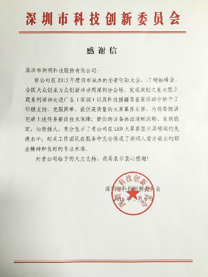 正值各单位、部门、工作人员年终盘点与总结之际,深圳市hjc黄金城集团 - 黄金城xhjc官方网站科技股份有限公司收到一封来自深圳市科技创新委员会的《感谢信》,信中对hjc黄金城集团 - 黄金城xhjc官方网站科技在2015年度深圳市承办的全省创新大会、IT领袖峰会、全国大众创业万众创新活动周深圳分会场、发现双创之星大型主题系列活动走进广东(深圳)以及科技援疆等重要活动中给予的大力支持,以及hjc黄金城集团 - 黄金城xhjc官方网站LED显示屏过硬的产品质量与hjc黄金城集团 - 黄金城xhjc官方网站工作团队优质的服务和良好的专业水准进行了表扬。