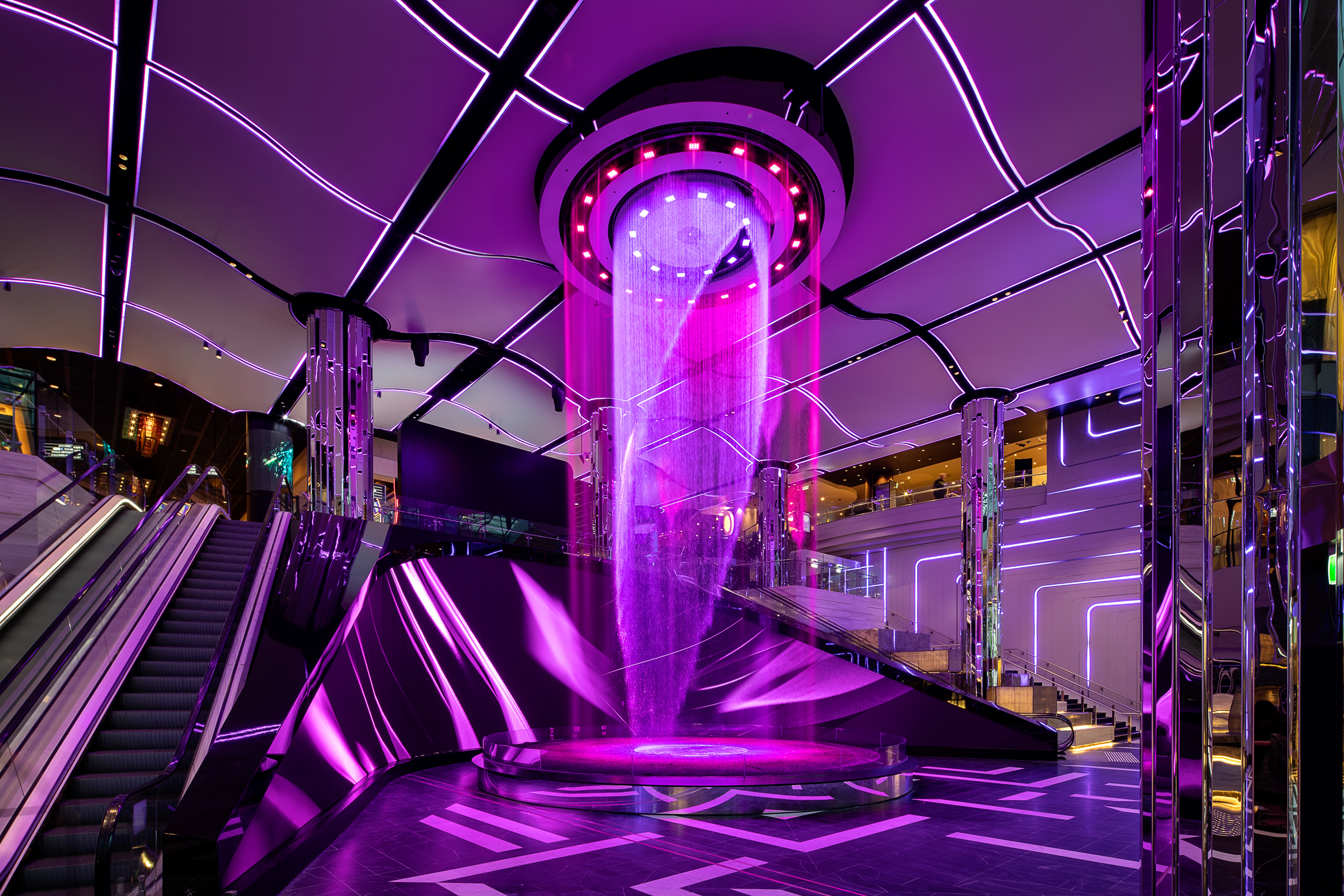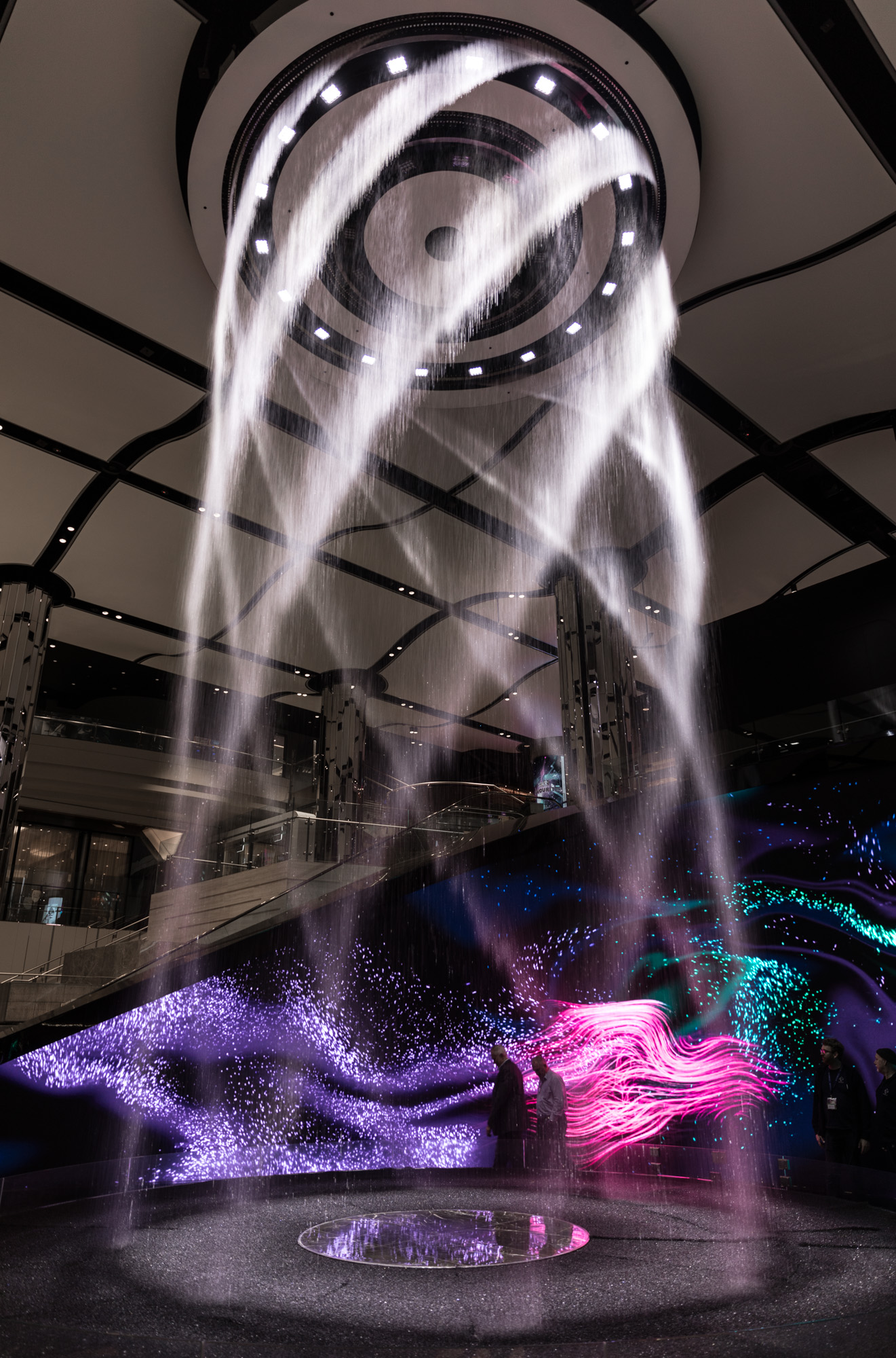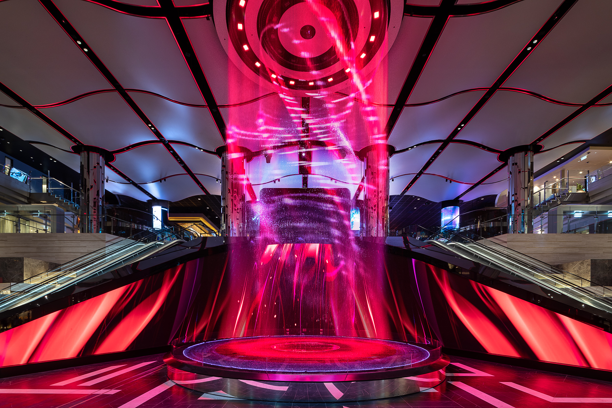 大屏旁的圆柱形装置使用了hjc黄金城集团 - 黄金城xhjc官方网站雷迪奥系列LED灯条,其灵活特性能够实现整齐的弧形安装,通过编程能够完美呈现不同造型的瀑布,充分展现了空间的灵感跃动。