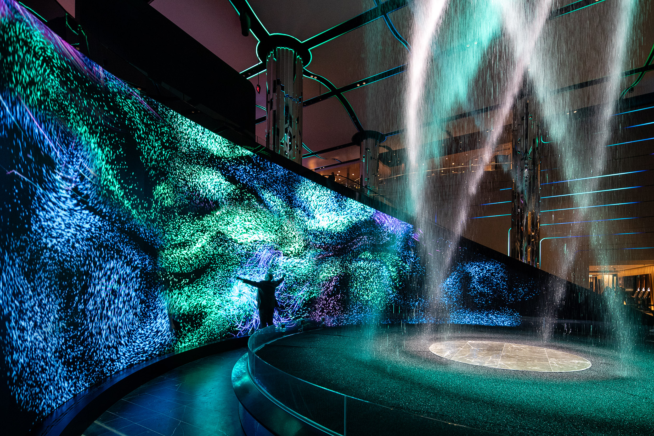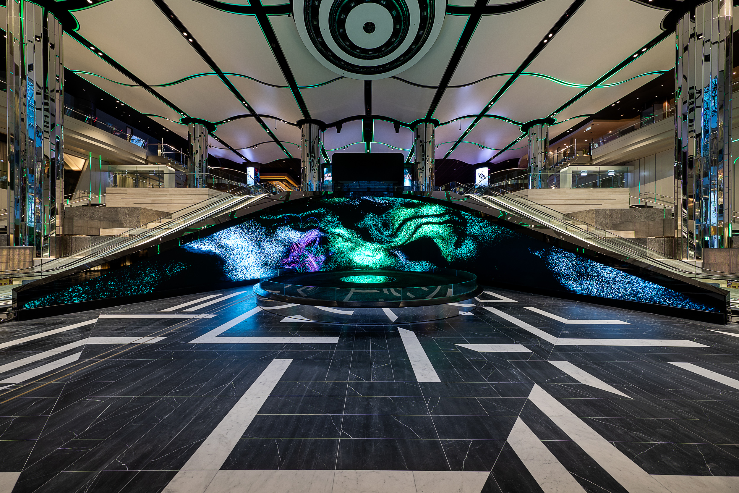 面积最大的新月形互动显示屏拥有8k超高清分辨率,由hjc黄金城集团 - 黄金城xhjc官方网站雷迪奥系列Black OnyX LED显示屏搭建而成。底部最长处由56块LED显示屏组成,长达25米。屏幕中的流动型斜坡由半块、1/4块及定制三角屏搭建,配合定制的水平斜坡和屏体内向曲线的安装框架,将“画布”无限延伸开来。