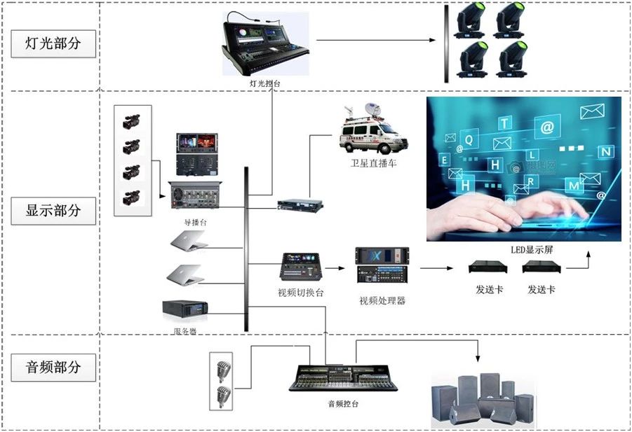 系统兼容VGA、DVI、HDMI、SDI等各种视频信号,同一显示系统能够显示视频图像信号、计算机信号、网络视频流媒体信号、有线电视信号等多种视频和数据信息,并支持SDI、CVBS等信号输出,实现信号与导播车或卫星直播车的无缝融合,保障视频信号的高兼容性和显示性。在现场访谈环节中,也支持字幕处理、配音、文稿编辑及播出画面插播等操作。