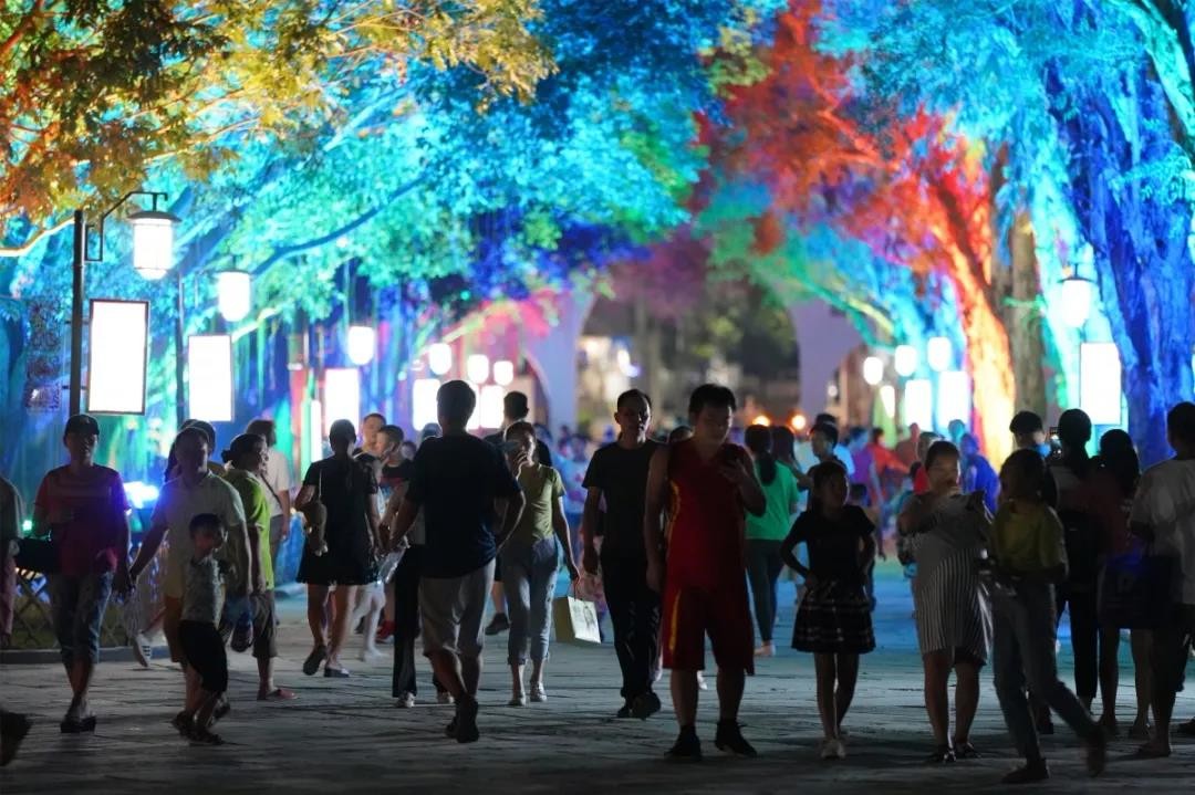 当游客踏进入口,犹如走进⼀片簇拥在月光下的彩云里,伴随着微风的吹拂,在簌簌的树叶声中和这古村一起融进了这斑斓的夜色里。