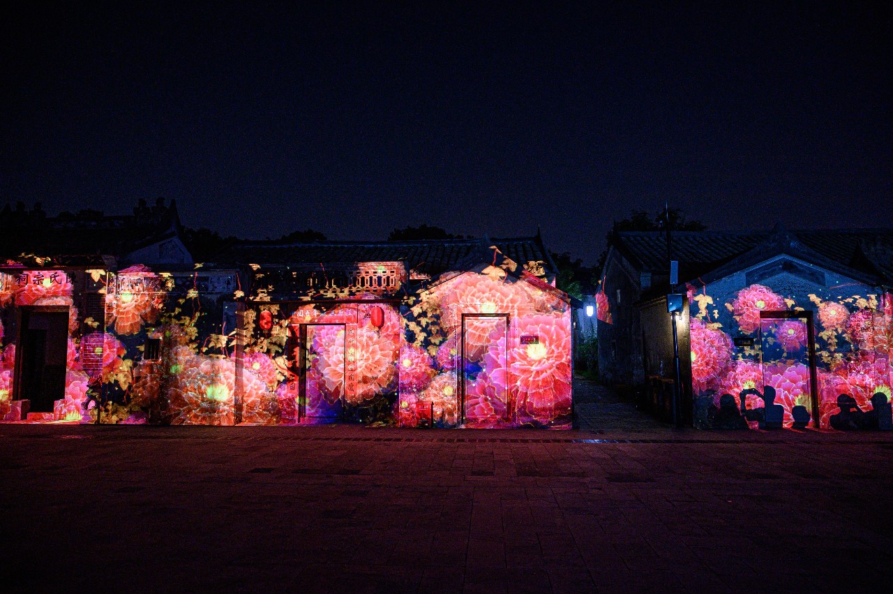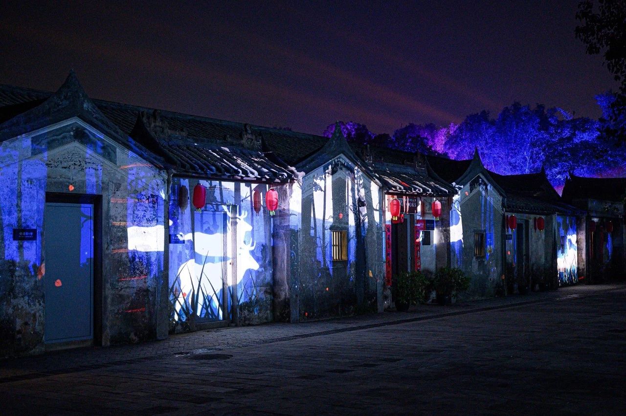 夜色中,客家古村落特有的排屋墙体成为了灯光艺术家们创作的画布,转动的牡丹、振翅的白鹤,跳动的小鹿,在上面逐一铺陈开来,勾勒出客家人最美好的生活愿景。