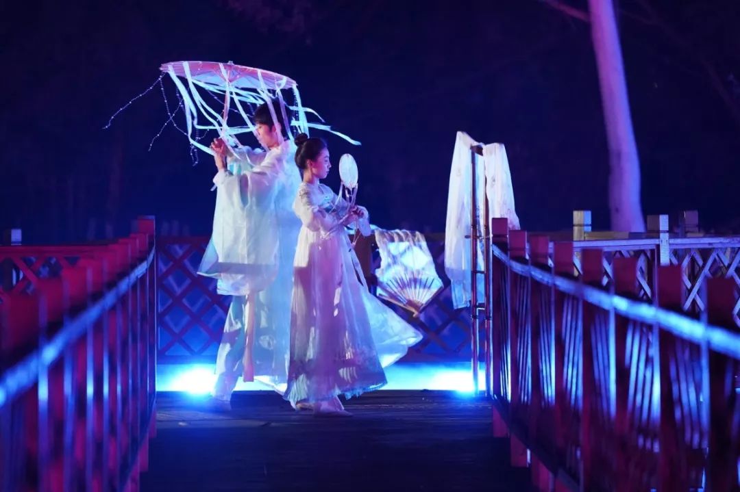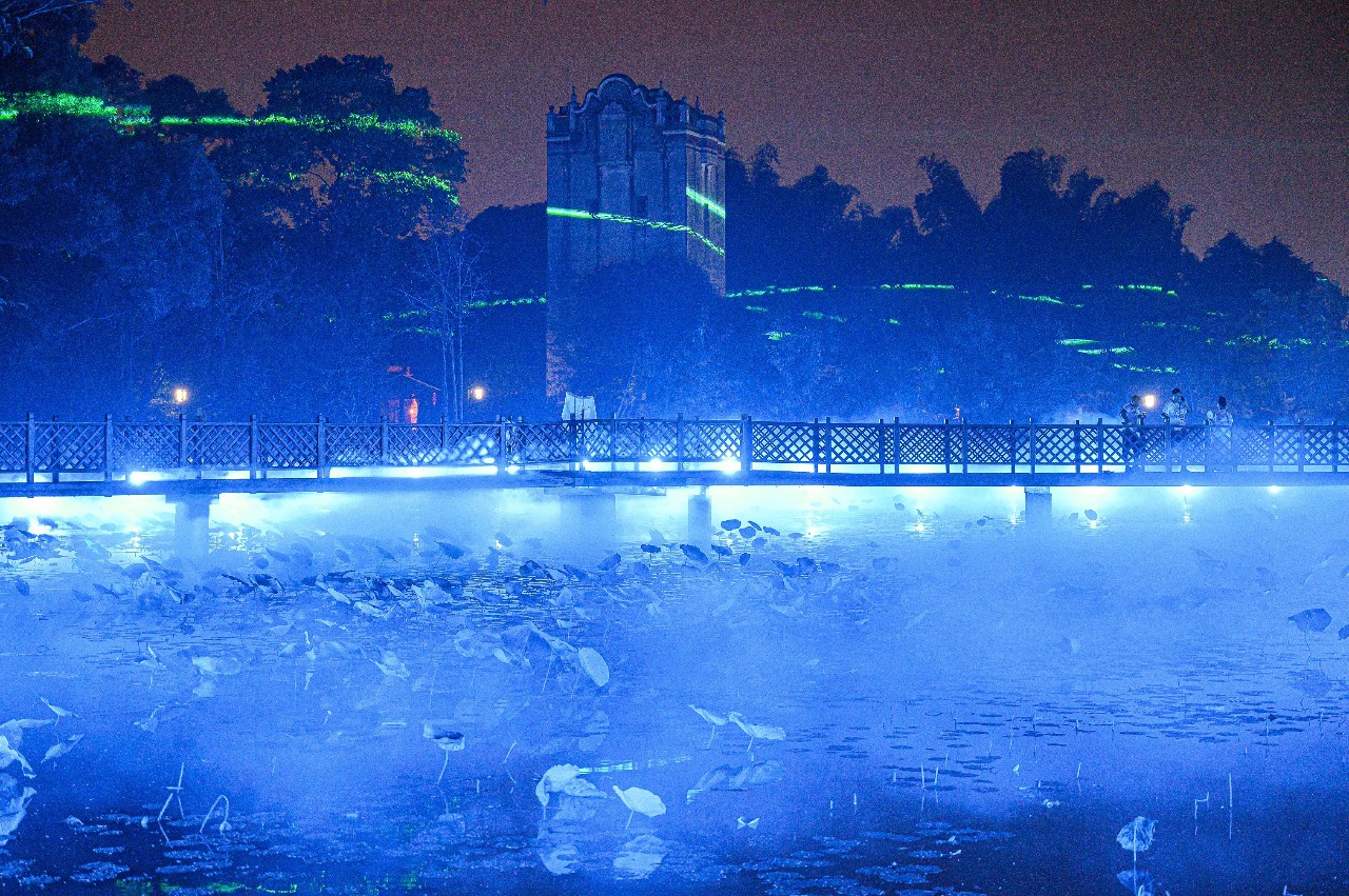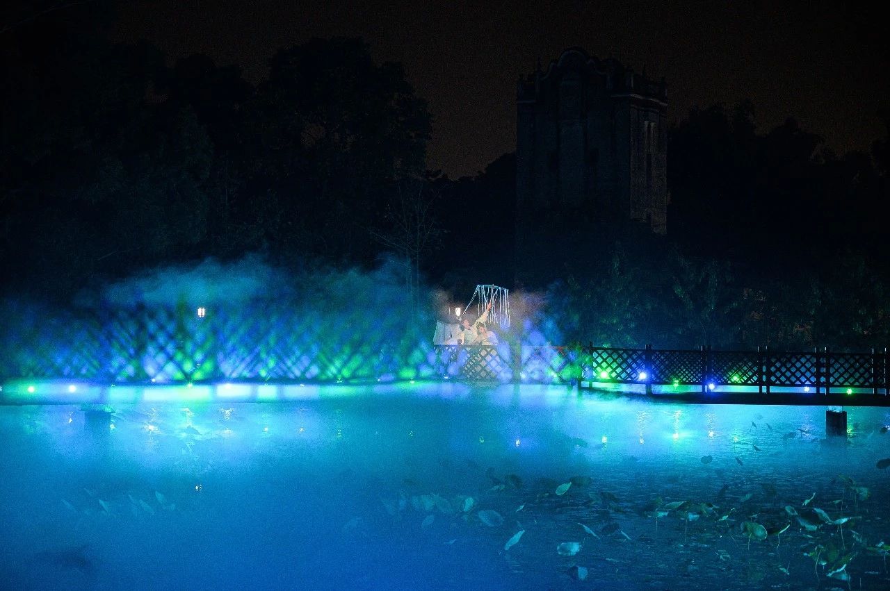 静静聆听,小桥流水,呦呦鹿鸣,丝竹之乐,此起彼伏。荷塘上扬起星星点点的光影,水下LED灯,激光,雾森,全息投影……成就了都市人向往的世外梦境。