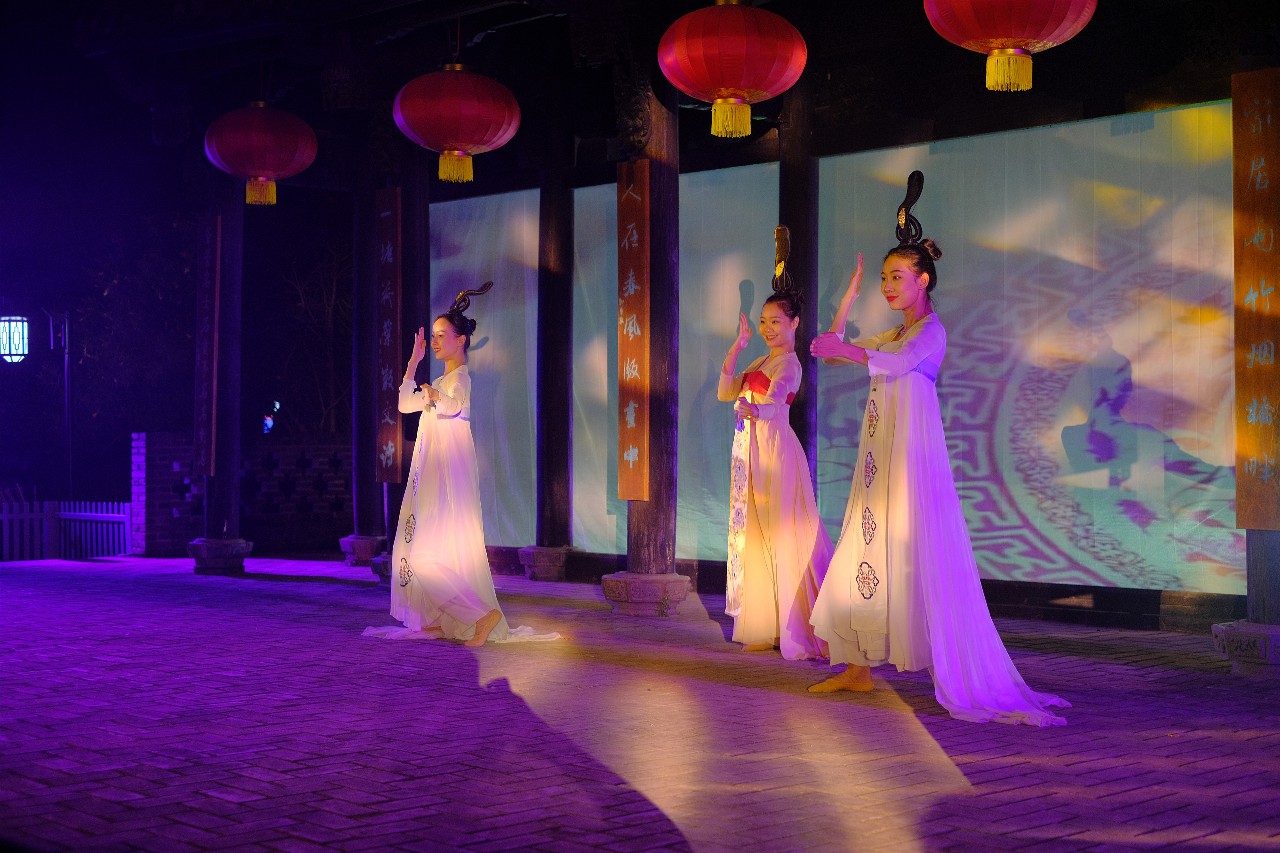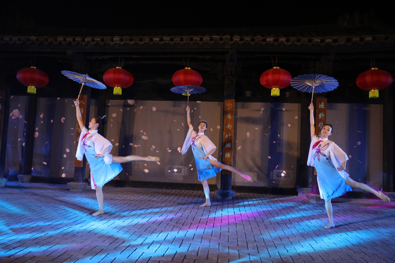国庆期间,古戏台上演绎了多场古风表演,舞姿曼妙轻盈,配合唯美的音乐和浪漫的灯光秀,为游客上演了一场光影+文化的视觉盛宴。