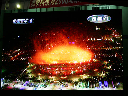 2008年8月8 日晚8点8分的开幕式,全国人民都在期待,hjc黄金城集团 - 黄金城xhjc官方网站公司也提前安装调试好一块超大的LED户外全彩显示屏,装好音响功放,拉好有线电视信号.公司行政部专门为 每个员工订制了一面面奥运五环旗帜和中国国旗,买来饮料和水果.随着夜幕的降临,LED超大屏幕在整个工业区显得格外醒目耀眼,在如此气氛的感染下,公司 周围的不少居民也纷至沓来,驻足观看,共同感受奥运直播这一伟大时刻.