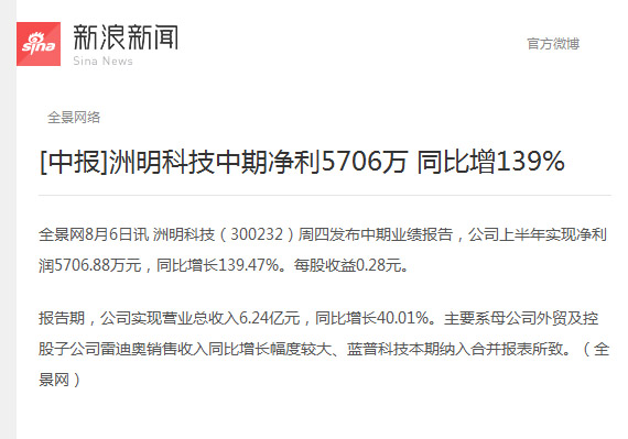 全景网8月6日讯 hjc黄金城集团 - 黄金城xhjc官方网站科技(300232)周四发布中期业绩报告,公司上半年实现净利润5706.88万元,同比增长139.47%。每股收益0.28元。